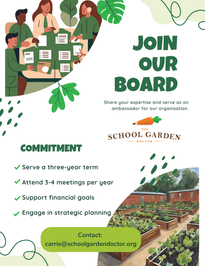 Are you looking to ‘level up’ your contribution to the school garden movement? The School Garden Doctor is recruiting Board Members for the 2025-2028 term. Wondering what a Board of Directors does? Here are some of the things the last board accomplished between 2021 and 2024: