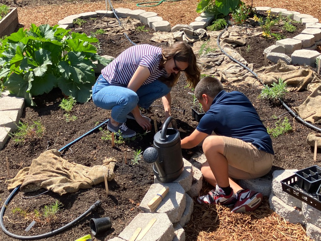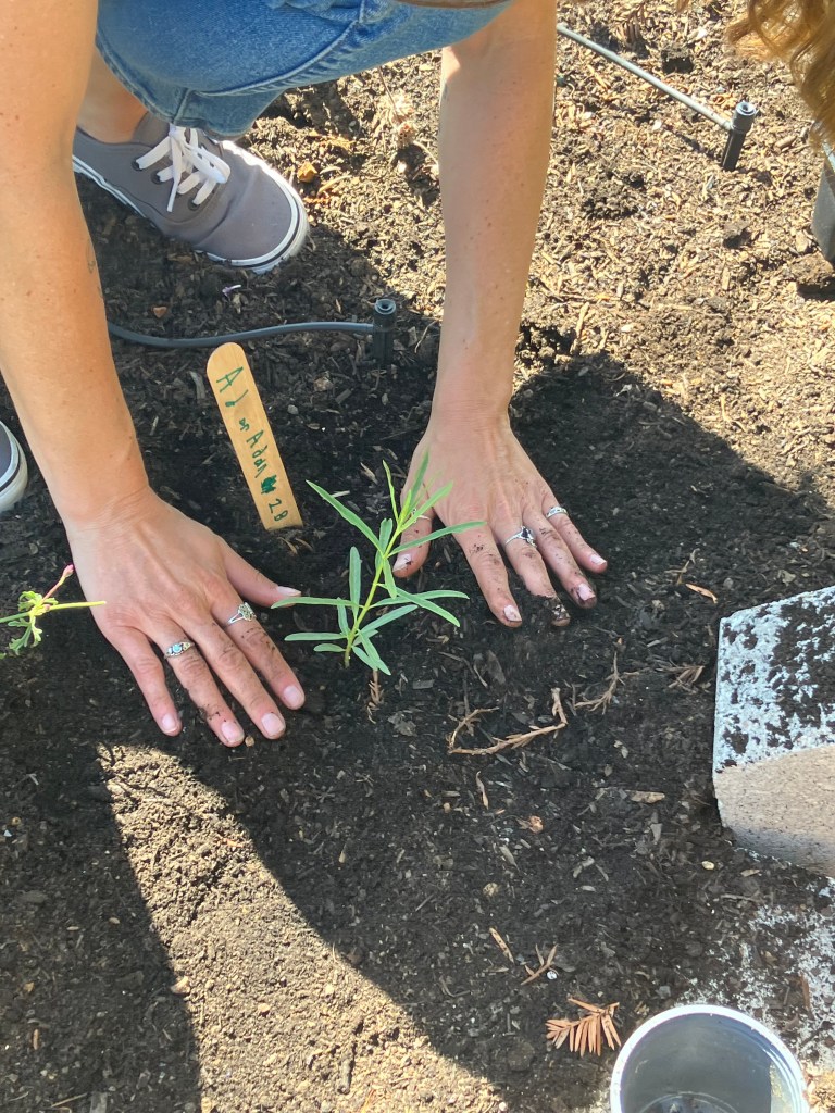 Secure Resources. With a site and community support, we secured resources like plants and infrastructure. Thanks to our Napa RCD connection to the Western Monarch Society, we received a donation of 18 milkweed plants. Our local chapter of the California Native Plant Society also donated a flat of flowering nectar plants. The parent club of the school invested a lot of time and energy in preparing the site. They purchased landscape bricks to replace two of the raised beds that were falling apart. Over a few weekend work days, parent volunteers shaped the bricks into a butterfly. Although our design was much more kid-guided, we did plant the milkweed last–and on the perimeter, as recommended by Solano RCD planting plans. Whatever design you choose, it’s important to have nectar plants that bloom throughout the seasons that monarchs are migrating. In California, that is typically early spring (as they leave the overwintering sites) and late summer (mid-September) when they make their way back.