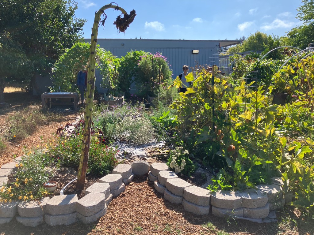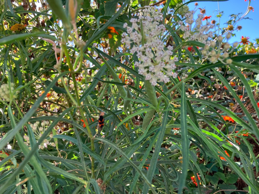 Share the Wonder. As soon as our partner site ‘named’ their garden, we registered the Waystation with Monarch Watch. Corazón Monarca was waystation number 49,500! Six months later, the Monarch Waystation is thriving! There is a volunteer pumpkin obscuring the shape of the brick butterfly over the summer, but was harvested in November. The narrow-leaf milkweed was flowering and/or going to seed in September and October. A healthy colony of aphids attracted ladybugs to complete their life cycle in our patch. We’ve seen a few butterflies, but no eggs or larvae yet. Maybe next year.